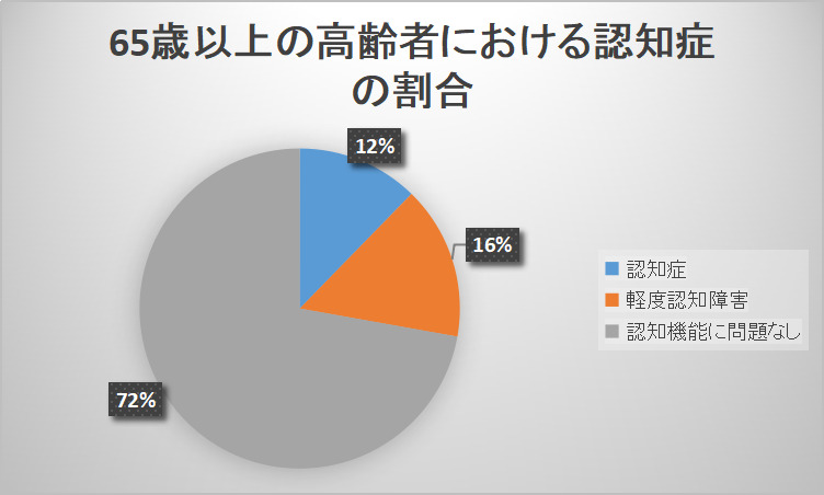 65歳以上の高齢者を対象にした令和4年度の『厚生労働省「認知症及び軽度認知障害(MCI)の高齢者数と有病率の将来推計』では、認知症の人の割合は約12%、認知症の前段階と考えられている軽度認知障害の人の割合は約16%とされています。