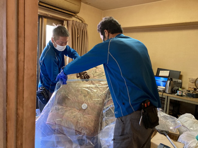 和室で遺品整理している最中のスタッフ