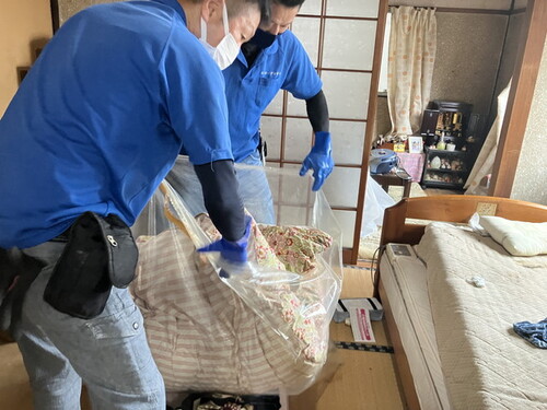 亡くなった場所の汚染物を搬出していきますが、体液が付着しているものについては、厳重に梱包します。