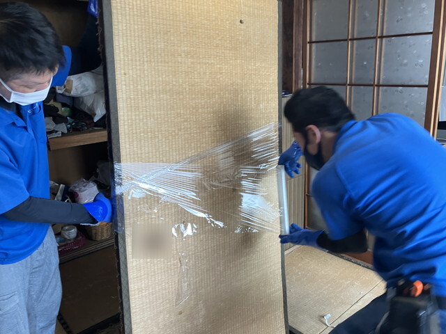 畳については、死臭が染みついているため全て撤去することになっていましたが、特に体液が付着しているものは、再汚染を防ぐためラッピングを行います。