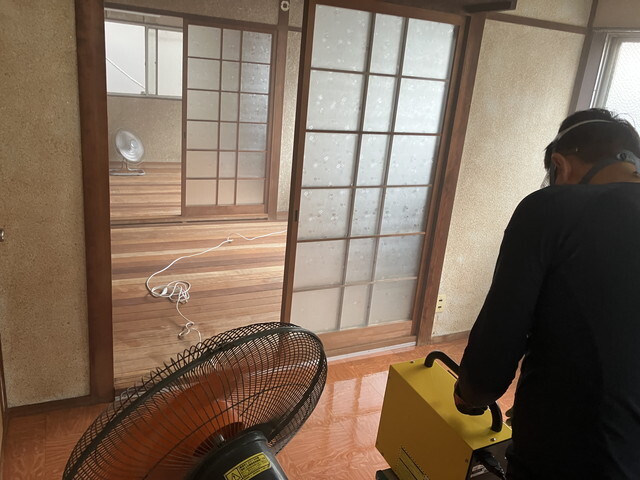 清掃後、特別な薬剤を部屋全体に噴霧し、オゾン脱臭機を使用しての除菌・消臭作業を行なって、死臭を除去していきます。