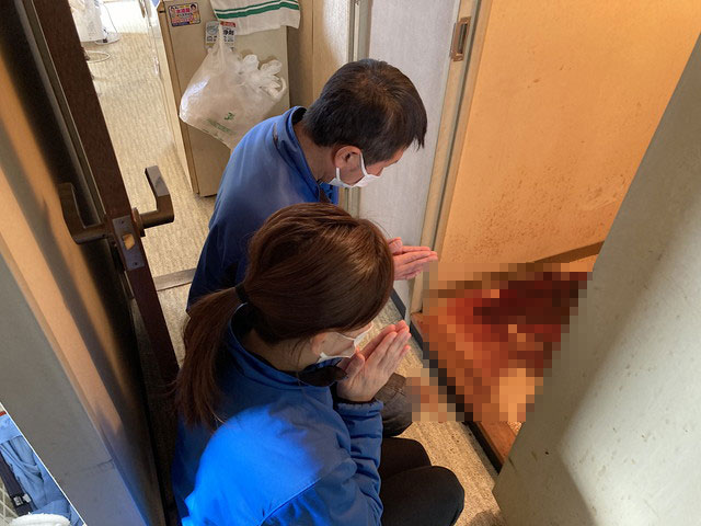 作業前にアパートの部屋の前で手を合わせ、入室させていただきます。