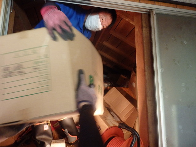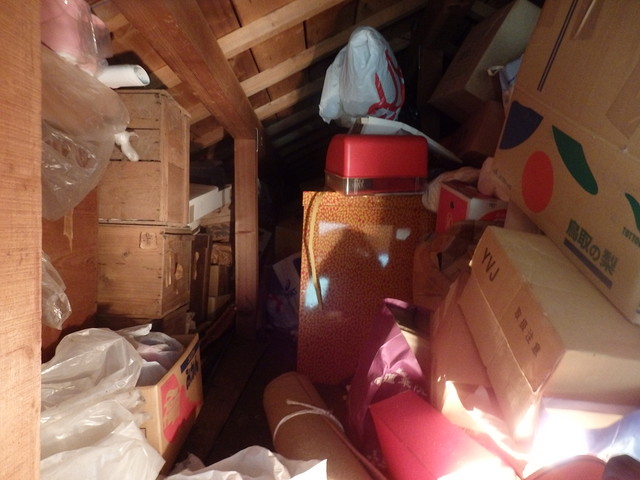 今回のお宅は2階に広い屋根裏収納があり、その中も相当量の荷物ですが解体予定のためタンス等の木製品のみを残し全ての搬出を行います。
