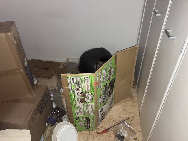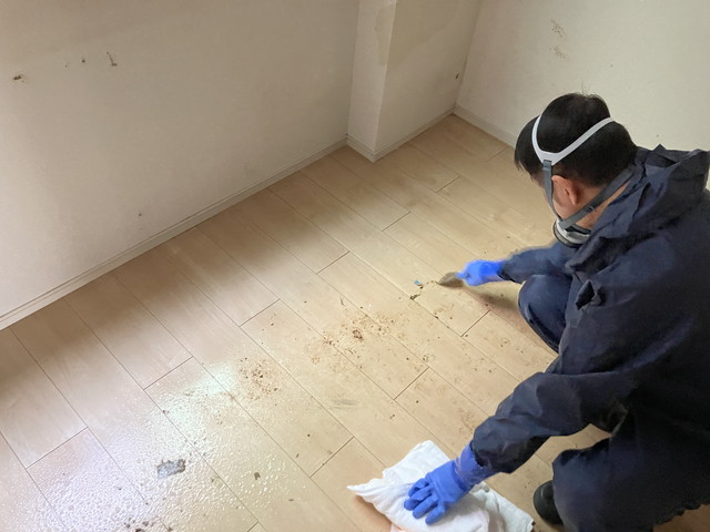 お部屋の物が無くなり残るは糞と死骸の跡の消臭、清掃作業に入ります。