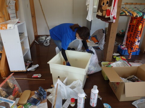 普段2階から作業開始することが多いですが、まずは荷物搬出の動線を作るため、1階の床に散らばった物から分別梱包を行いました。