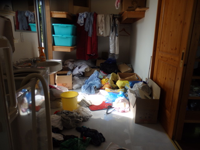 1階のLDKは洋服や食料品などの生活用品が散乱している状態、2階の和室は物置に使用されていたようで、段ボールが積み上げられていたり季節用品が収められていました。