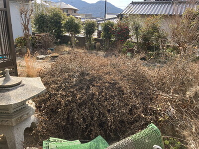 とお伝えし、そのままお庭の倉庫解体や、草木の剪定、花器や置物の撤去を追加でご依頼頂けました。