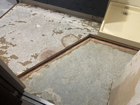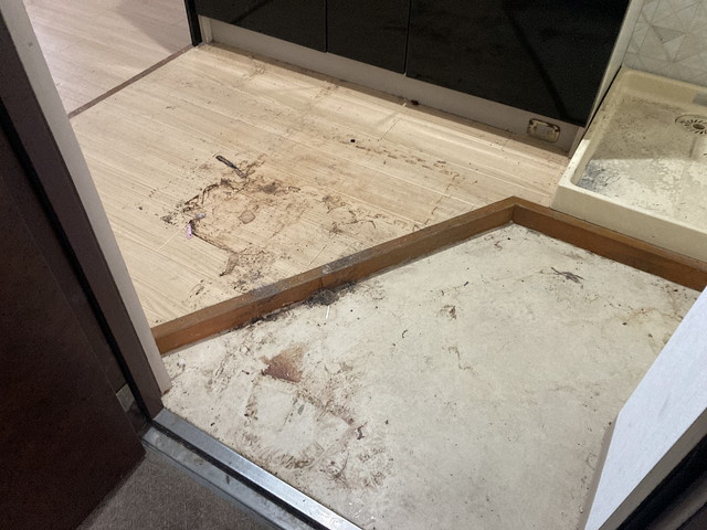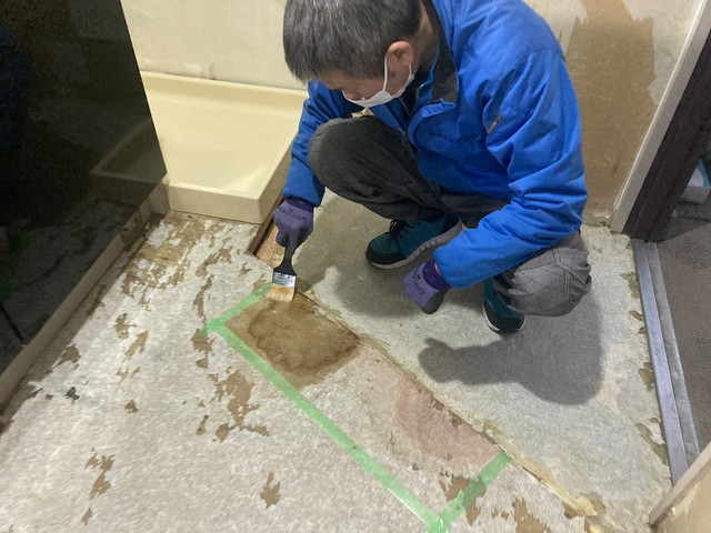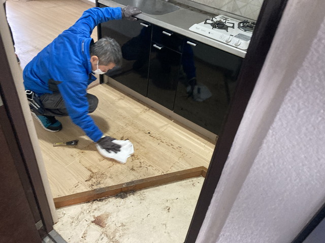 清掃後にクッションフロアーを剥がすと体液の後がありましたので再度専用薬剤を使用し清掃し匂いを封じ込るために専用薬剤でコーティング作業を行いました。