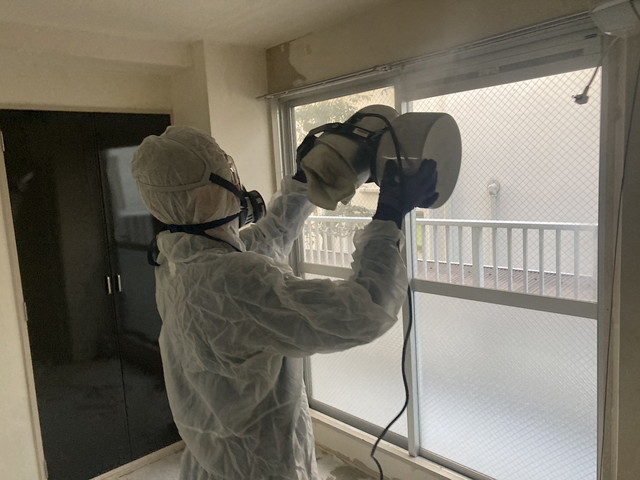 コーティング作業を終え部屋全体の死臭を取り除く必要があるため部屋全体のクロスと床下のクッションフロアー剥がし、ハウスクリーニングを終え専用薬剤を部屋全体に噴霧作業を行い高濃度オゾン脱臭機を使用しました。