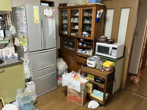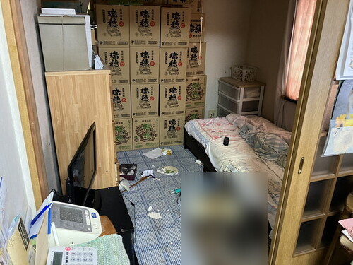 その他のお部屋でもキッチンなど直近まで生活されていた形跡があり、棚の中などにも整理品が詰まっており、寝室にはお酒の空瓶が入った段ボールなども山積みになっている状態でした。