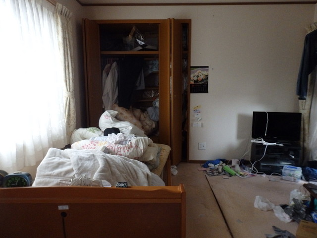 基本的には特殊清掃から開始することが多いのですが、今回はカーペットの上にベッドが配置されていましたので、はじめにベッドの撤去から行いました。