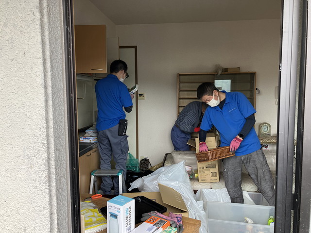 生前整理となりまずスタッフでミーティングを行い必要な物や残す物など共有し、部屋に残された衣類や日用品などを仕分け、家庭ごみなどが散乱している状態で可燃ごみ、不燃ごみを分別し大型家具、テーブルなどリサイクル出来ない物は搬出を行い、貴重品や思い出のお品など誤って処分しないよう徹底的に丁寧に仕分け作業を進めました。