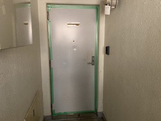 玄関ドアには養生テープで目張りがしてあり相当な臭いであることは想像ができた。