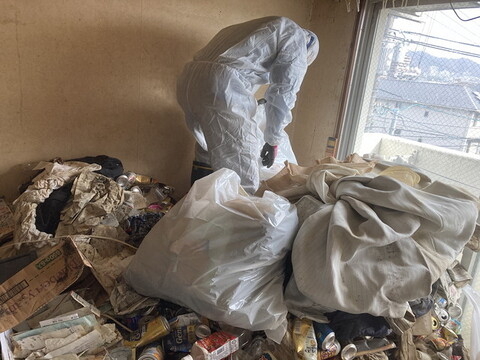 玄関やキッチン周辺は膝上ぐらいのゴミの山、室内は掃き出し窓の半分以上までゴミが積み上げられており、ユニットバスの中もゴミで埋め尽くされて使用できる状態ではありません。