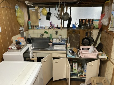 お部屋の間取りは2DKでしたがとくにキッチン周り等直前まで生活をされていたご様子で、部屋全体的に家財道具や家電製品、日用品など多く残っている状態でした。