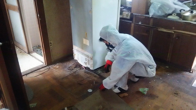 お部屋の間取りはアパートの2Kのお部屋で、管理会社様にお伺いしていた通りかなり腐敗臭が進んでおり、害虫などもかなり居る状況でした。